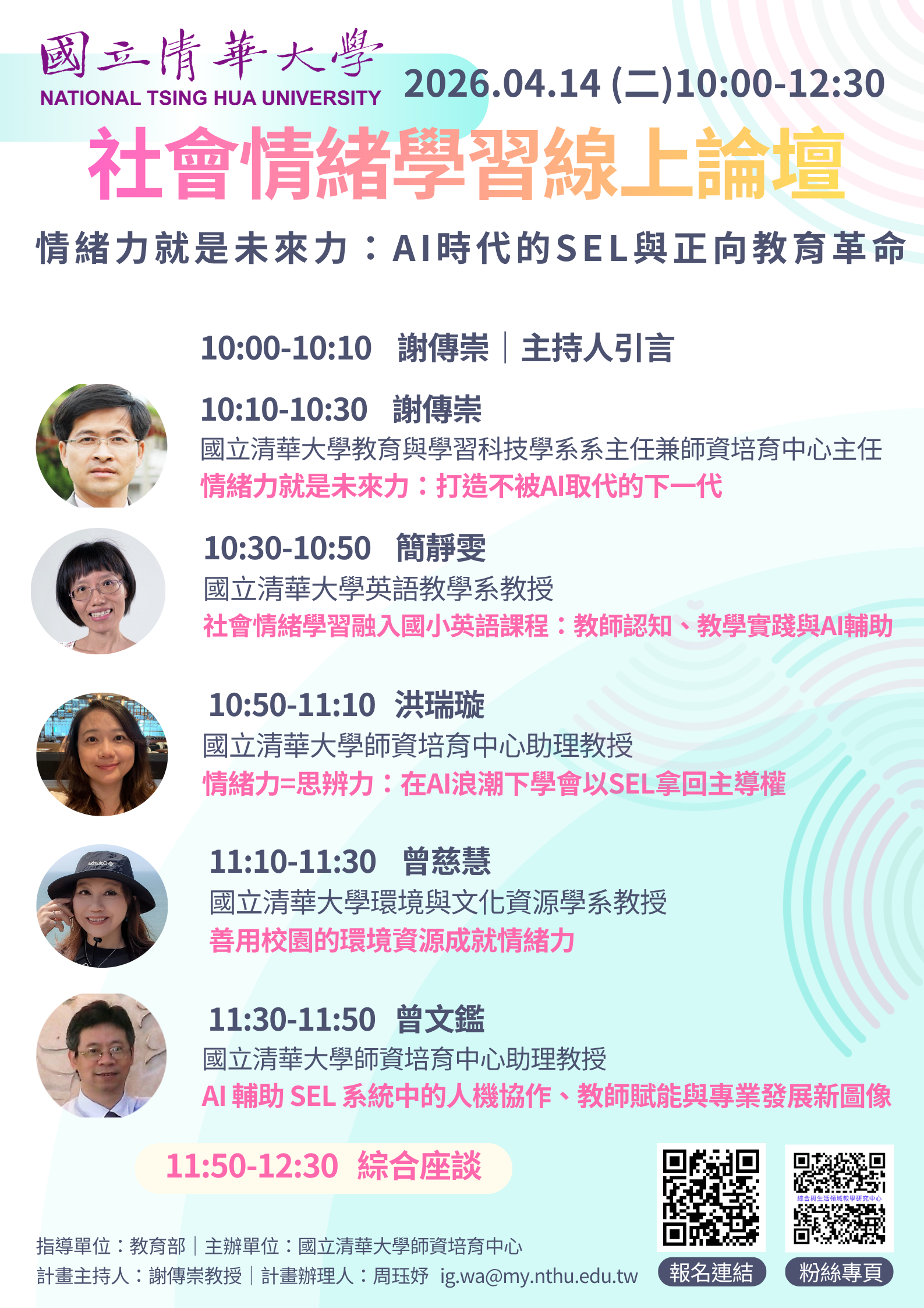 二、 論壇主持人:謝傳崇(國立清華大學教育與學習科技學系主任/師資培育中心主任);邀請謝傳崇(國立清華大學教育與學習科技學系系主任兼師資培育中心主任)、簡靜雯(國立清華大學英語教學系教授)、洪瑞璇(國立清華大學師資培育中心助理教授)、曾慈慧(國立清華大學環境與文化資源學系教授)、曾文鑑(國立清華大學師資培育中心助理教授)針對主題進行專題演講分享。